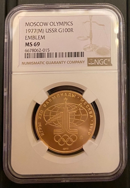 Золотая монета 100 рублей "Аллегория Спорт и Мир" Олимпиада 80, 15,55г., 1977г. в слабе NGC MS 69