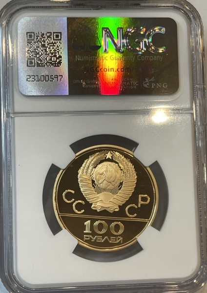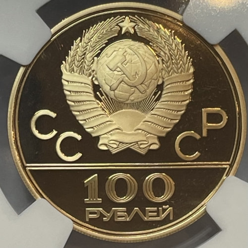 Золотая монета 100 рублей "Спортивный зал Дружба" ММД, 1979г. в слабе NGC PROOF 70 ULTRA CAMEO