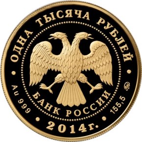 в центре – эмблема Банка России (двуглавый орёл с опущенными крыльями, под ним – надпись полукругом "БАНК РОССИИ"), обрамленная кругом из точек и надписями по кругу – вверху: "ОДНА ТЫСЯЧА РУБЛЕЙ", внизу: слева – обозначения драгоценного металла и пробы сплава, в центре – дата выпуска "2014 г.", справа – содержание химически чистого металла и товарный знак монетного двора.