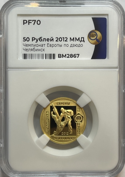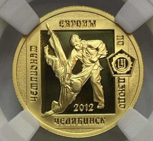 Золотая монета 50 рублей "Чемпионат Европы по Дзюдо в г. Челябинск" 7,78 грамм 2012 год в слабе ННР PROOF 70