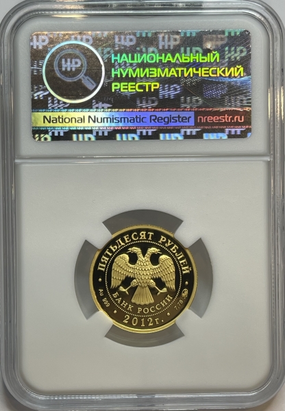 в центре диска - эмблема Банка России (двуглавый орел с опущенными крыльями, под ним - надпись полукругом "БАНК РОССИИ"), обрамленная кругом из точек и надписями по кругу - вверху: "ПЯТЬДЕСЯТ РУБЛЕЙ", внизу: слева - обозначения драгоценного металла и пробы сплава, в центре - дата выпуска "2012 г.", справа - содержание химически чистого металла и товарный знак монетного двора.