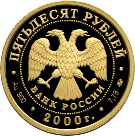 в центре диска - эмблема Банка России (двуглавый орёл художника И. Билибина, под ним надпись полукругом "БАНК РОССИИ"), обрамлённая кругом из точек и надписями по кругу: вверху - "ПЯТЬДЕСЯТ РУБЛЕЙ", внизу - "2000 г.", слева - обозначение металла, проба сплава, справа - содержание драгоценного металла в чистоте и товарный знак монетного двора.