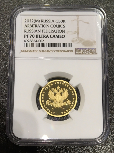 в центре диска на зеркальном поле - эмблема Высшего арбитражного суда Российской Федерации, вдоль канта - круговая надпись: "АРБИТРАЖНЫЕ СУДЫ РОССИЙСКОЙ ФЕДЕРАЦИИ".