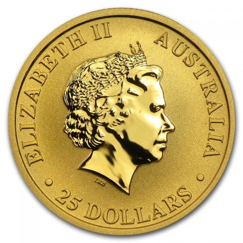 На аверсе золотой монеты Австралийский кенгуру изображен портрет королевы Елизаветы II. Сверху надпись ELIZABETH II — Елизавета II, AUSTRALIA — Австралия и год выпуска монеты. Внизу номинал монеты 25 DOLLARS. С нижней стороны портрета имеется надпись «IRB», обозначающая инициалы автора изображенного портрета – Иена Рэнка-Бродли.