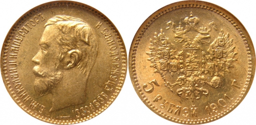 В 1901 году пятирублевая монета изготавливалась Санкт-Петербургским монетным двором из золота 900 пробы относительно большим тиражом. Сегодня стоимость такой золотой монеты зависит от стоимости металла, из которого она выполнена, её состояния и сохранности. Редких разновидностей этой монеты пока не обнаружено.
