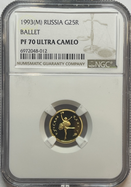 Золотая монета "Русский балет", 25 рублей, 1993 год, 3,11г., Au 999, ММД, в слабе NGC PROOF 70 ULTRA CAMEO