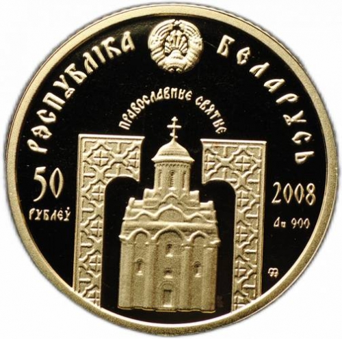 Аверс: вверху – рельефное изображение Государственного герба Республики Беларусь; в верхней части по кругу – надпись: РЭСПУБЛІКА БЕЛАРУСЬ; в центре – по кругу надпись: ПРАВОСЛАВНЫЕ СВЯТЫЕ; под ней на фоне орнамента изображение макета–реконструкции Спасо – Преображенского храма в Полоцке; слева – номинал: 50 РУБЛЁЎ на золотой и 10 РУБЛЁЎ на серебряной; справа – год чеканки, проба сплава и фирменный (товарный) знак Монетного двора Польши.